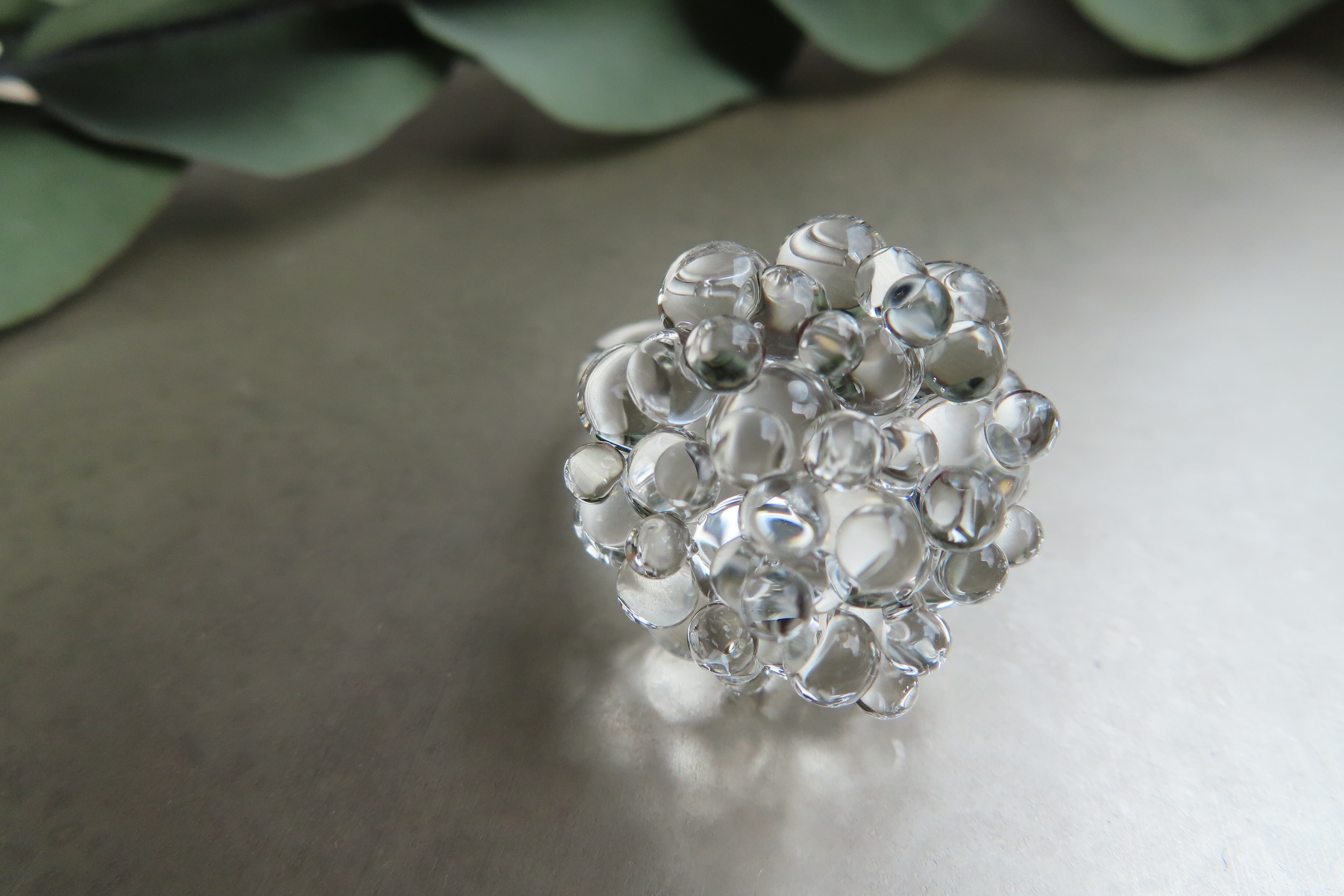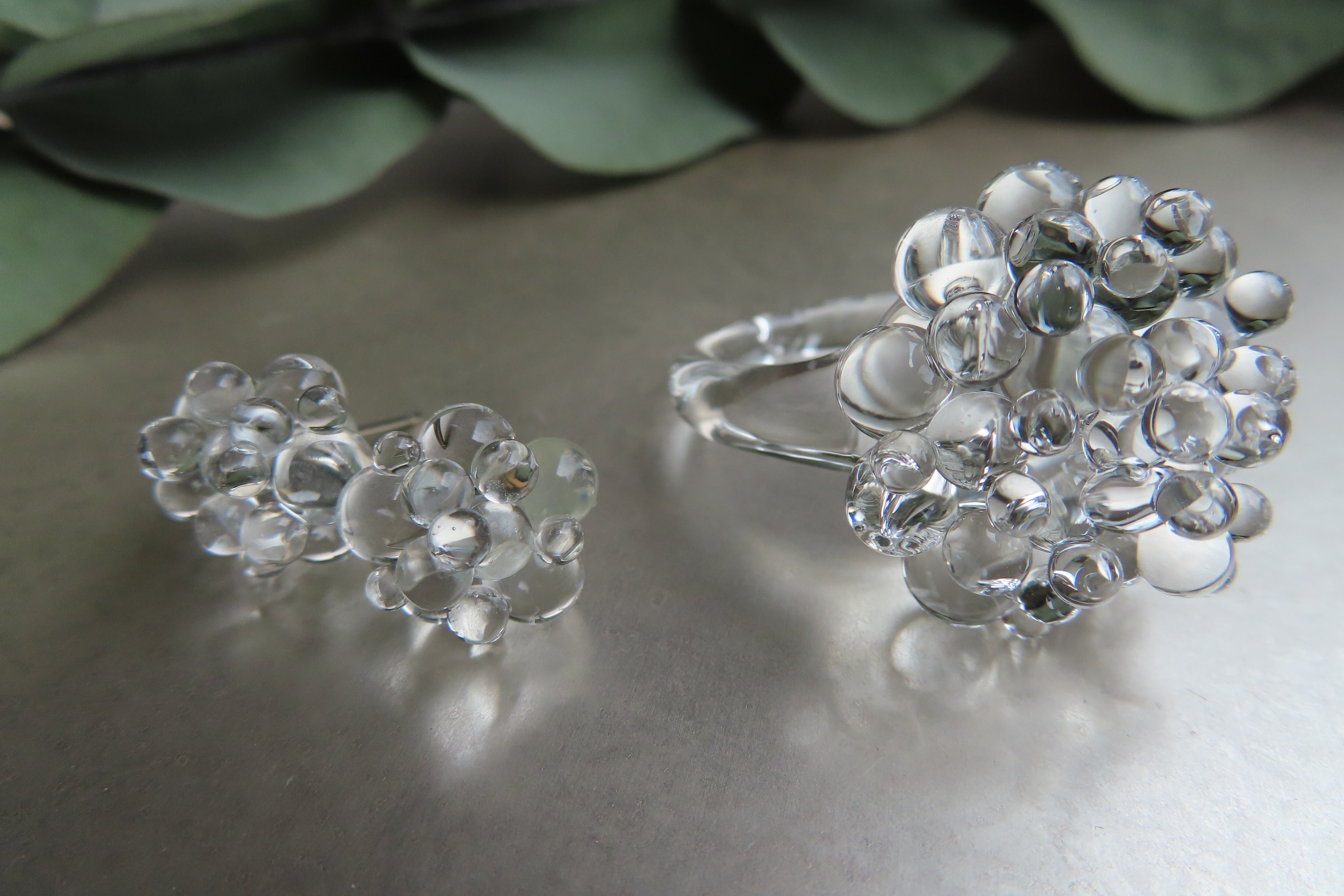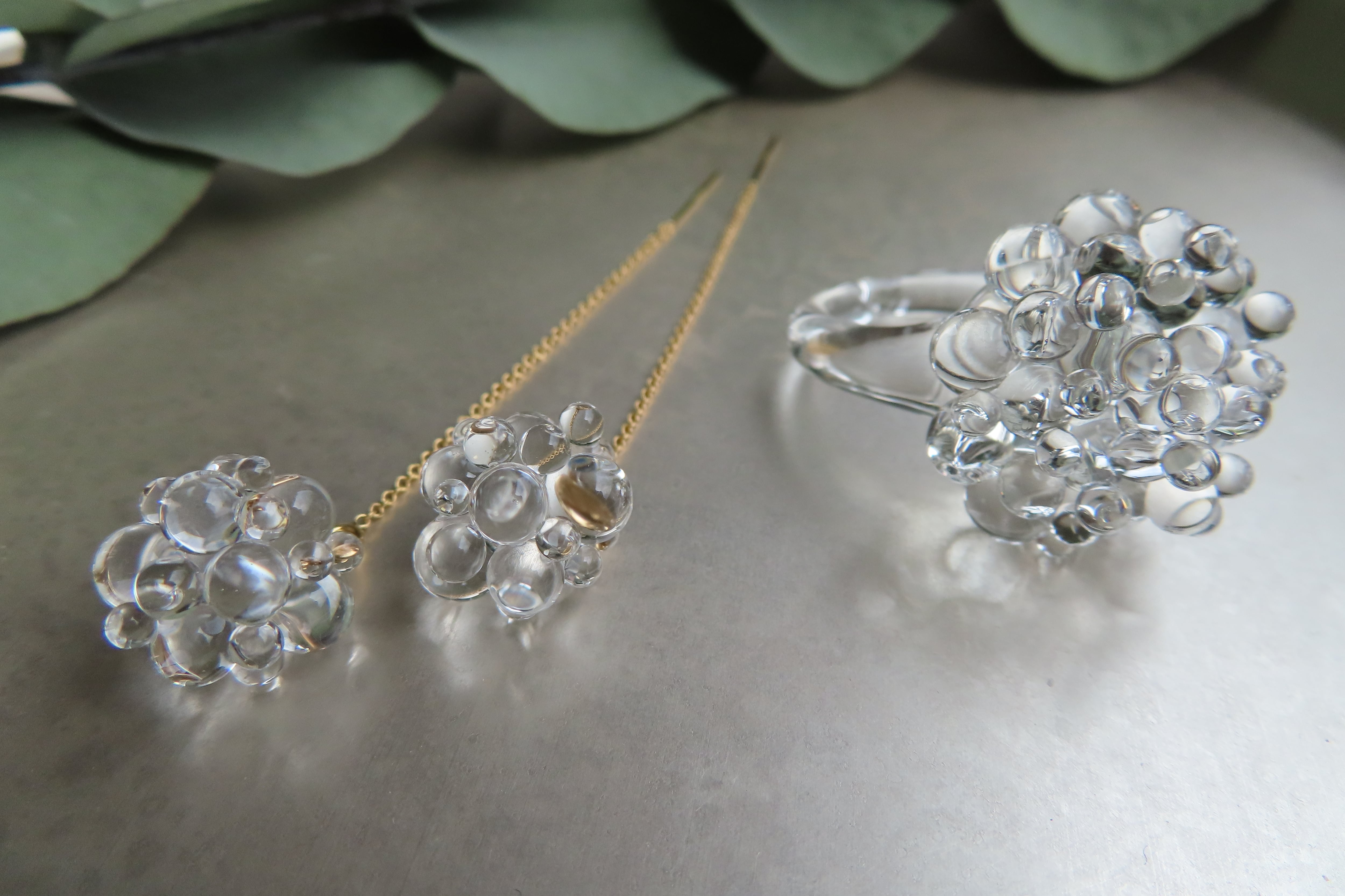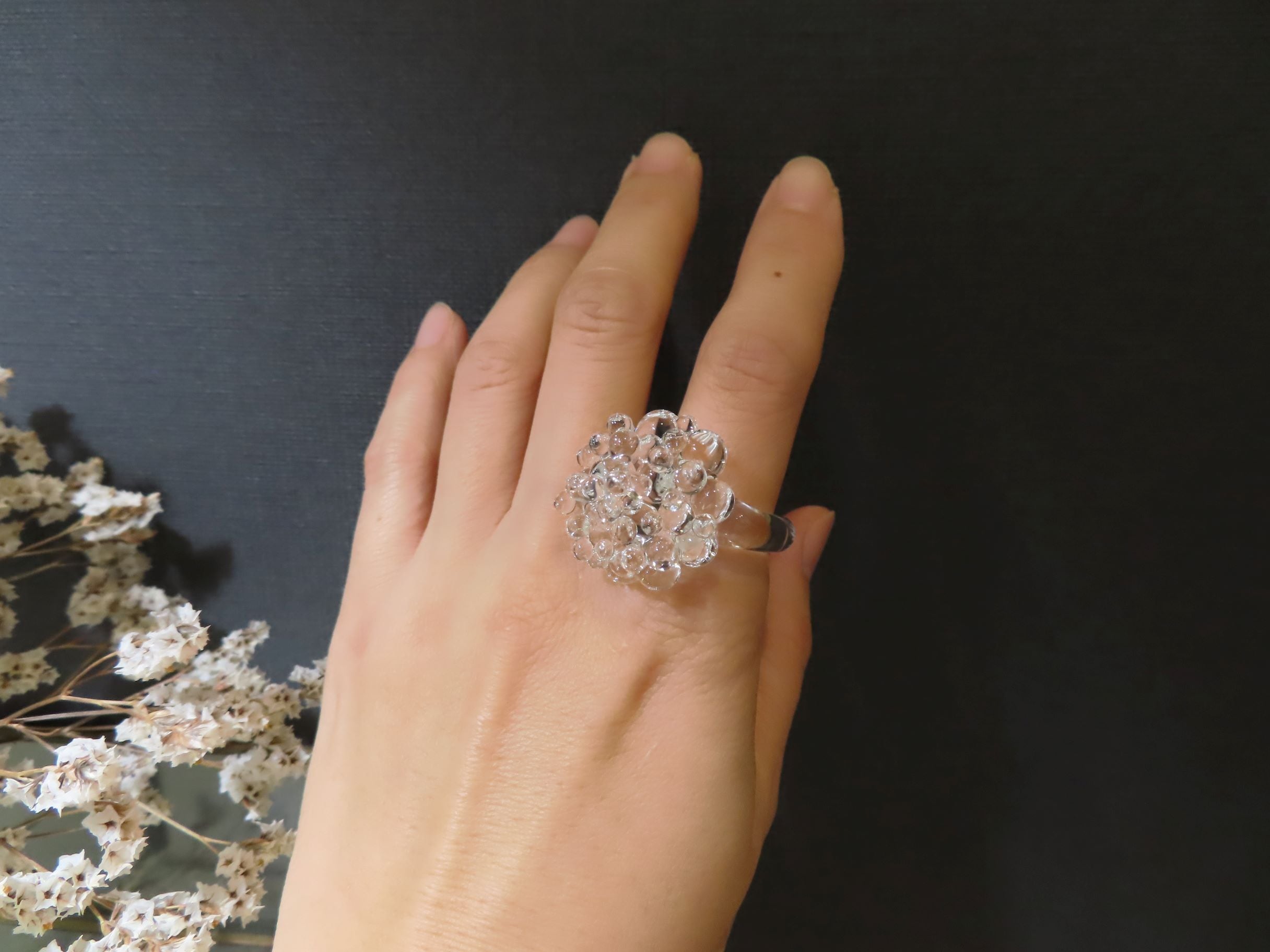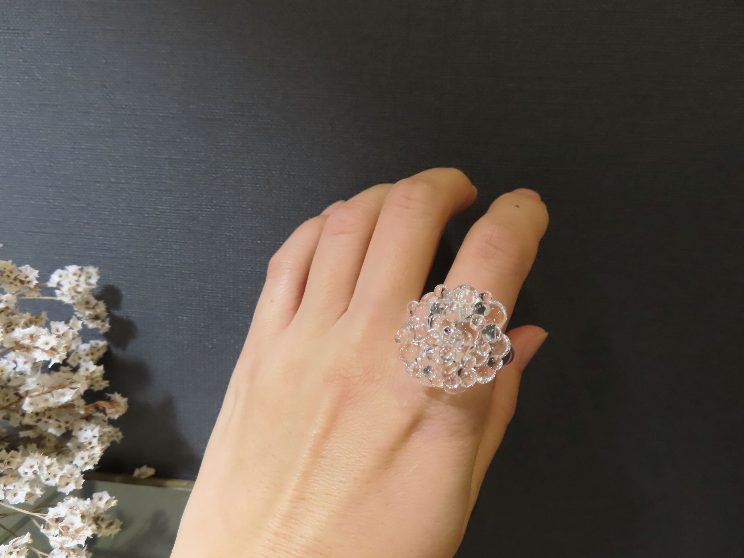 透明な粒が無数にひろがる、瑞々しいガラスリングです