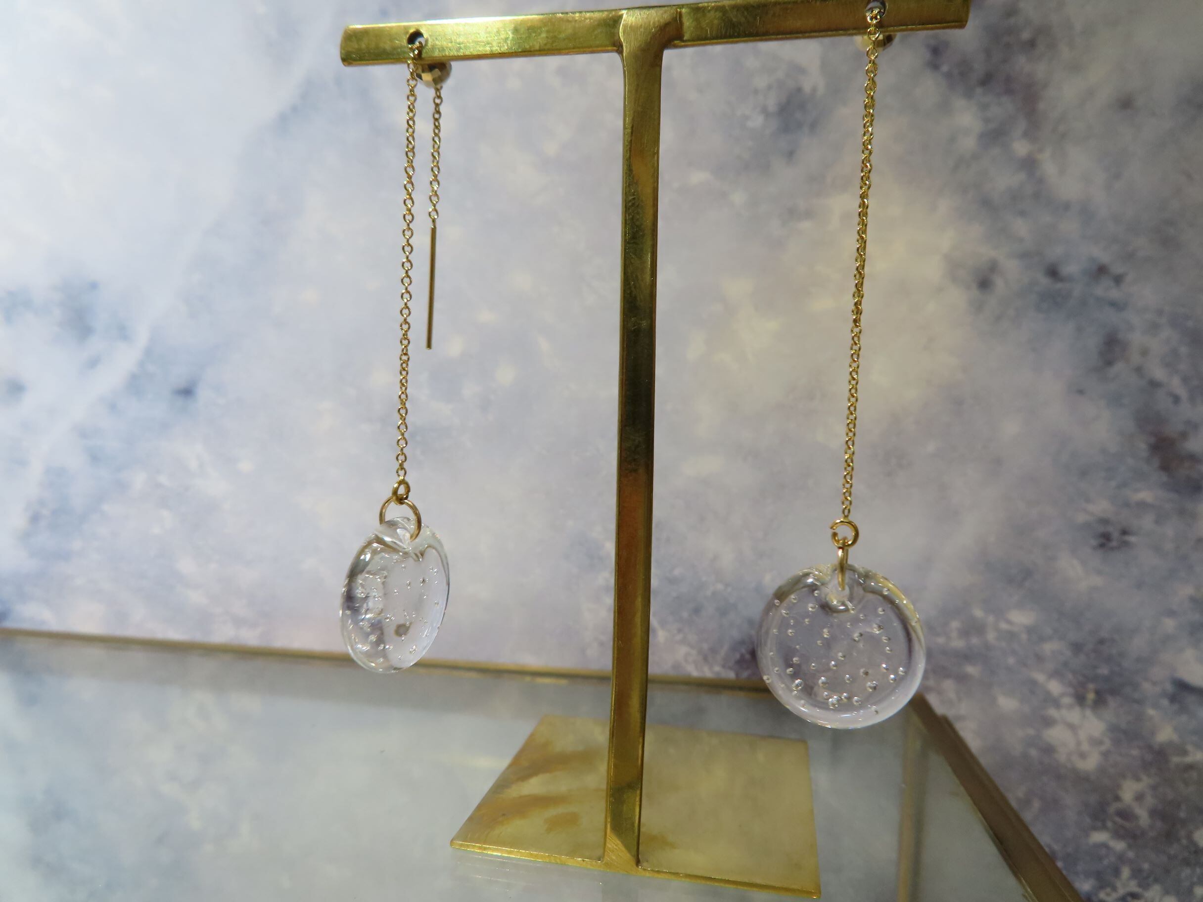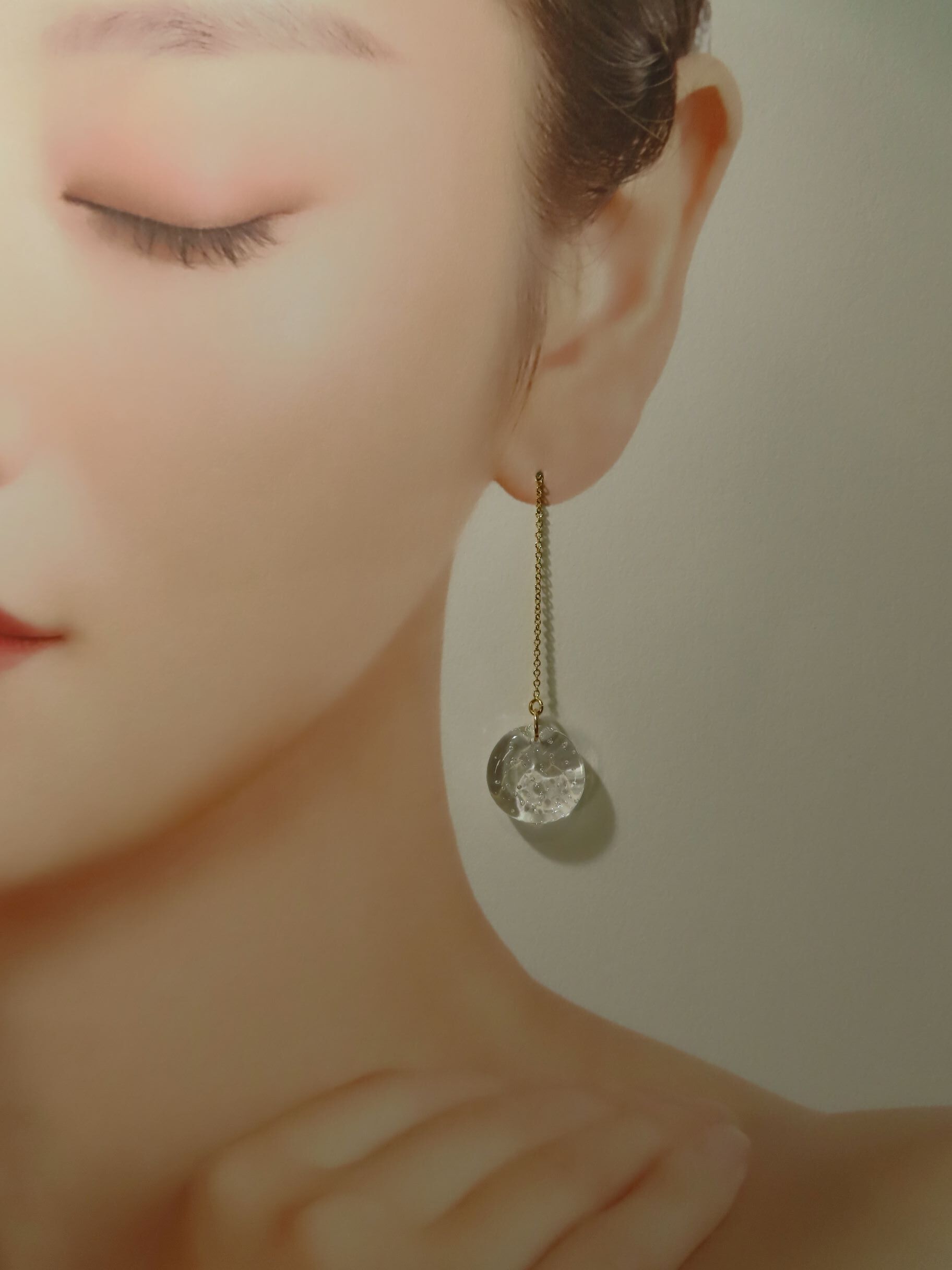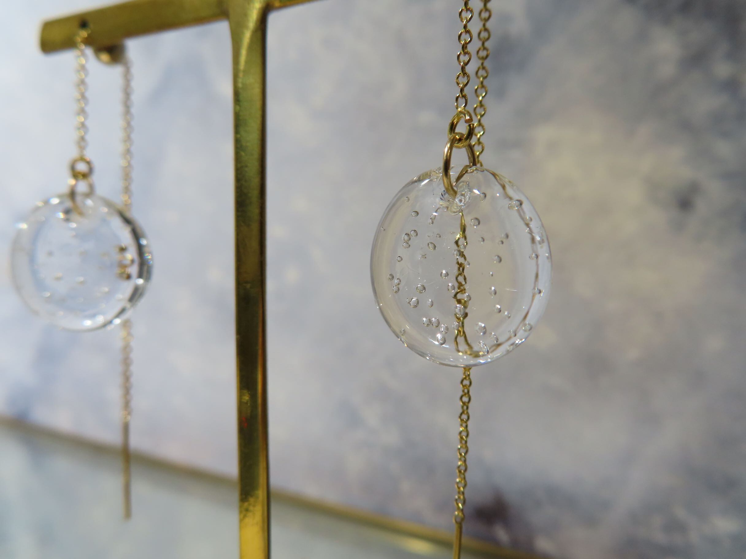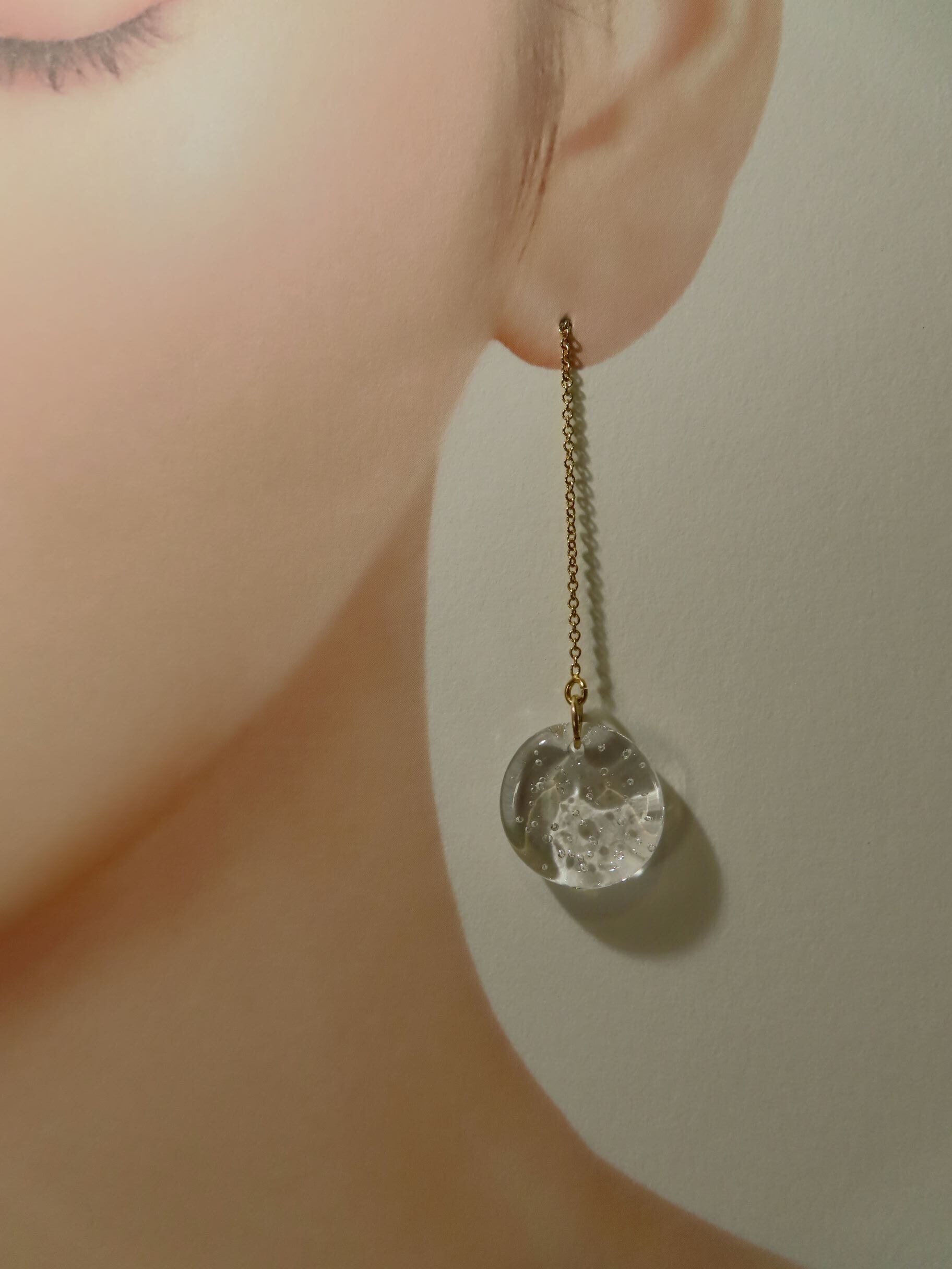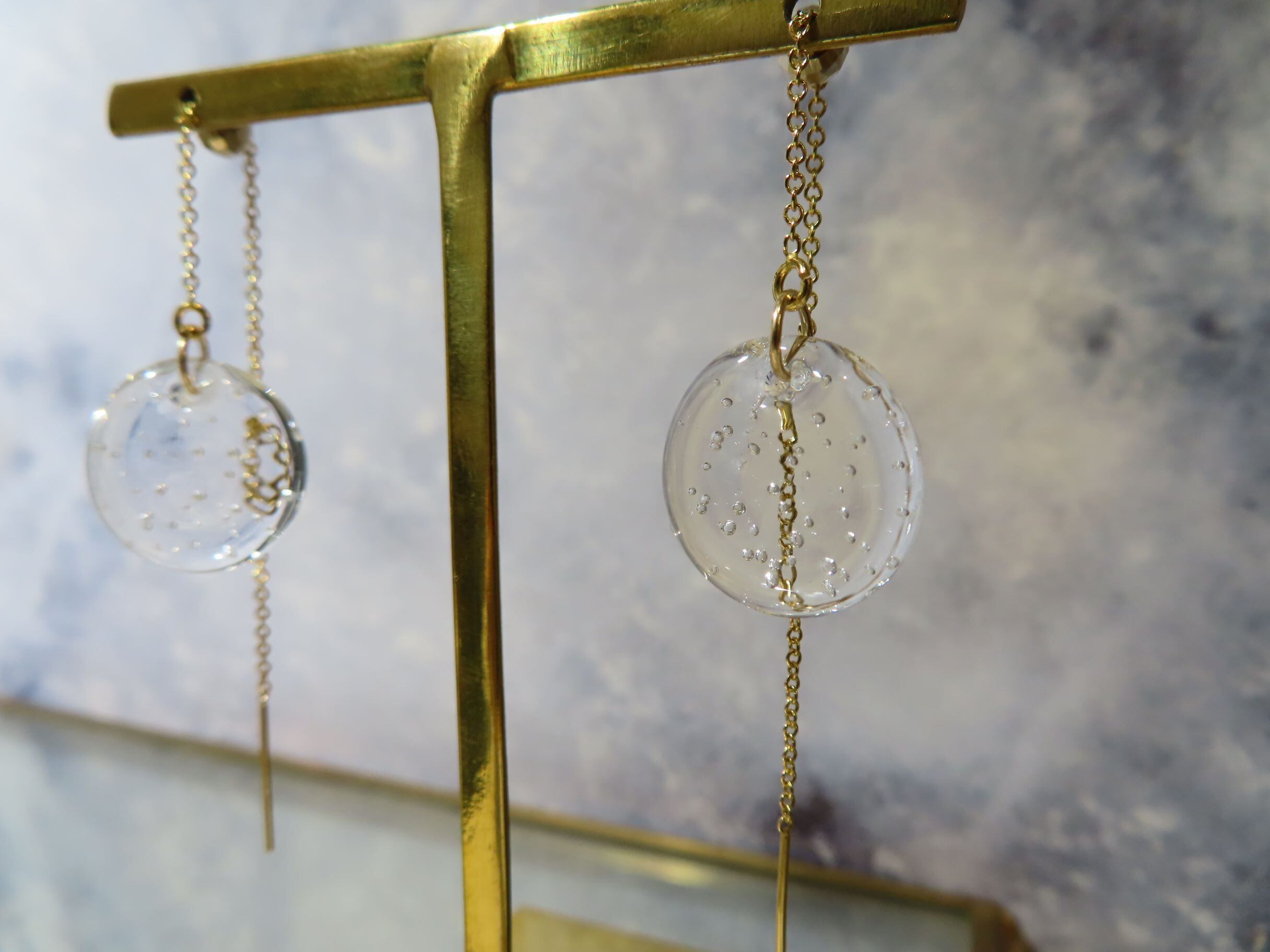 繊細なガラスでできたピアスは、光が透過して輝き、耳元を彩ります