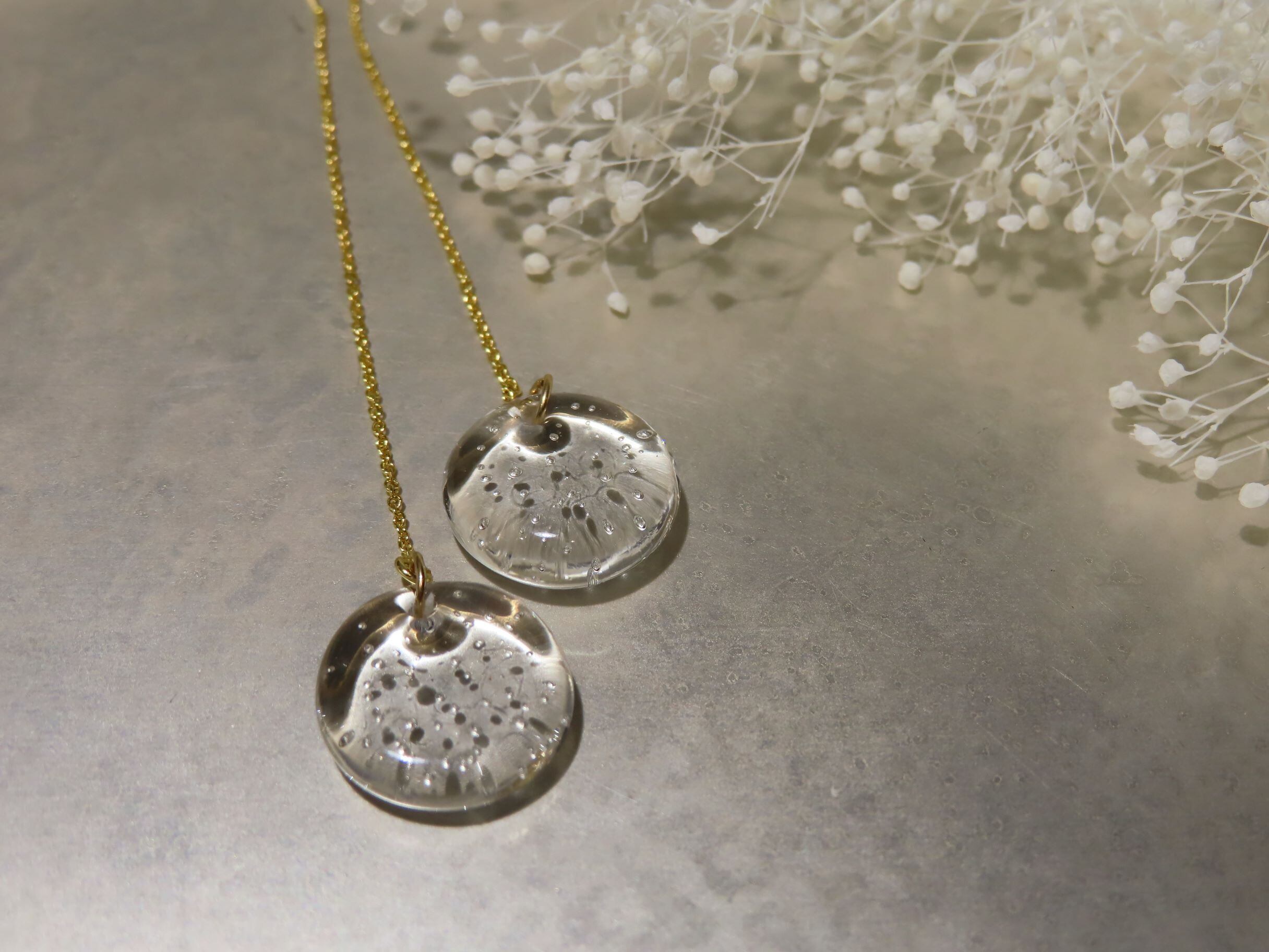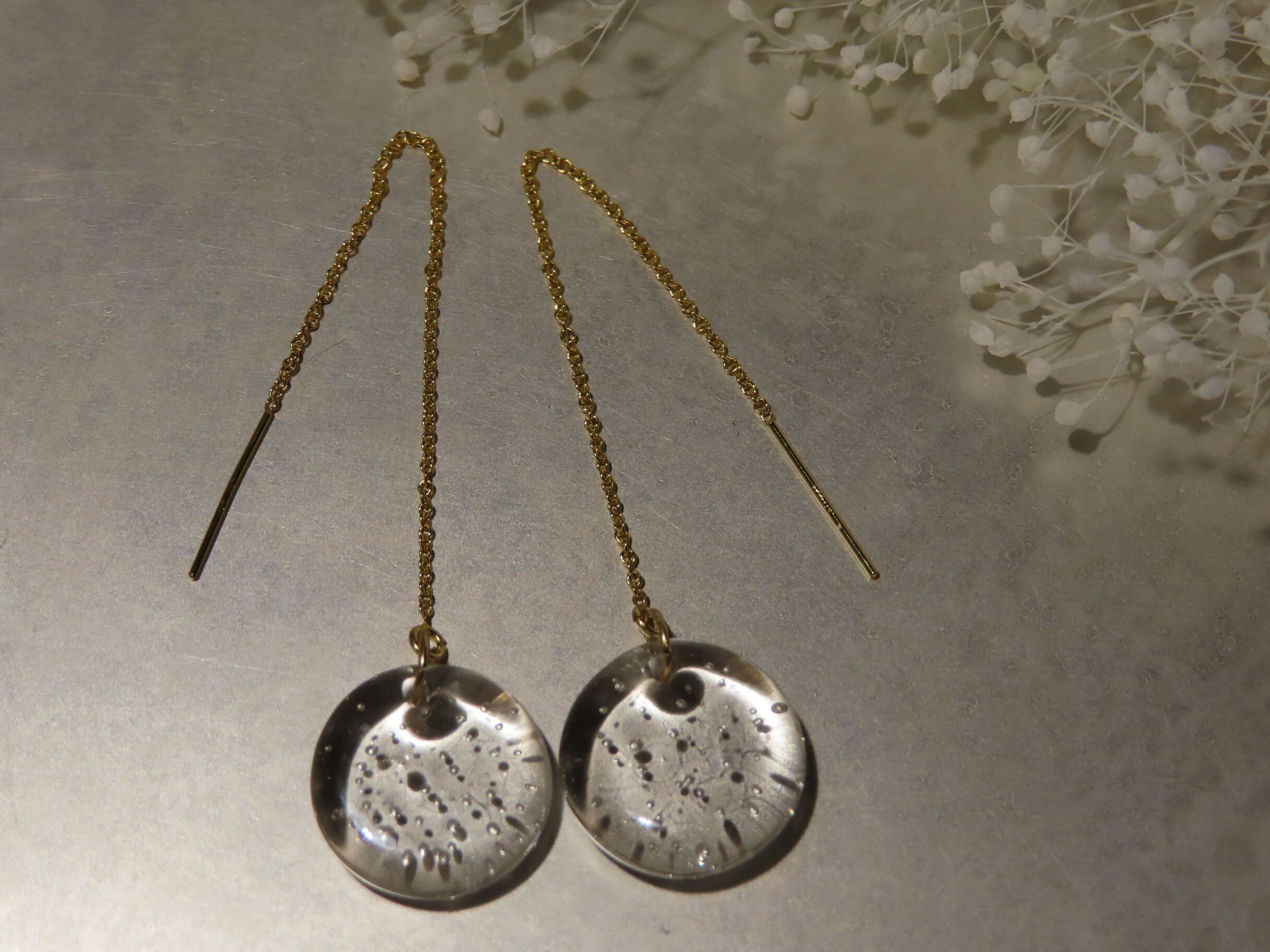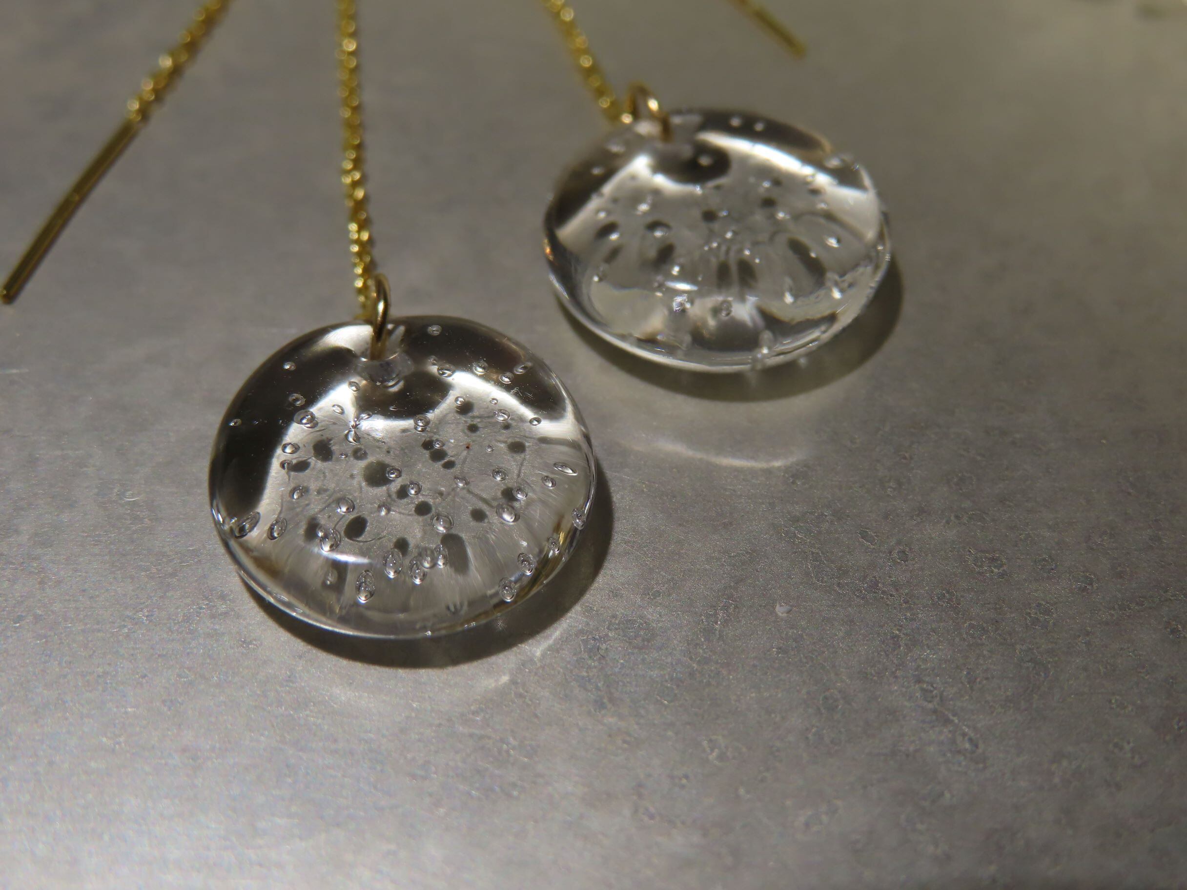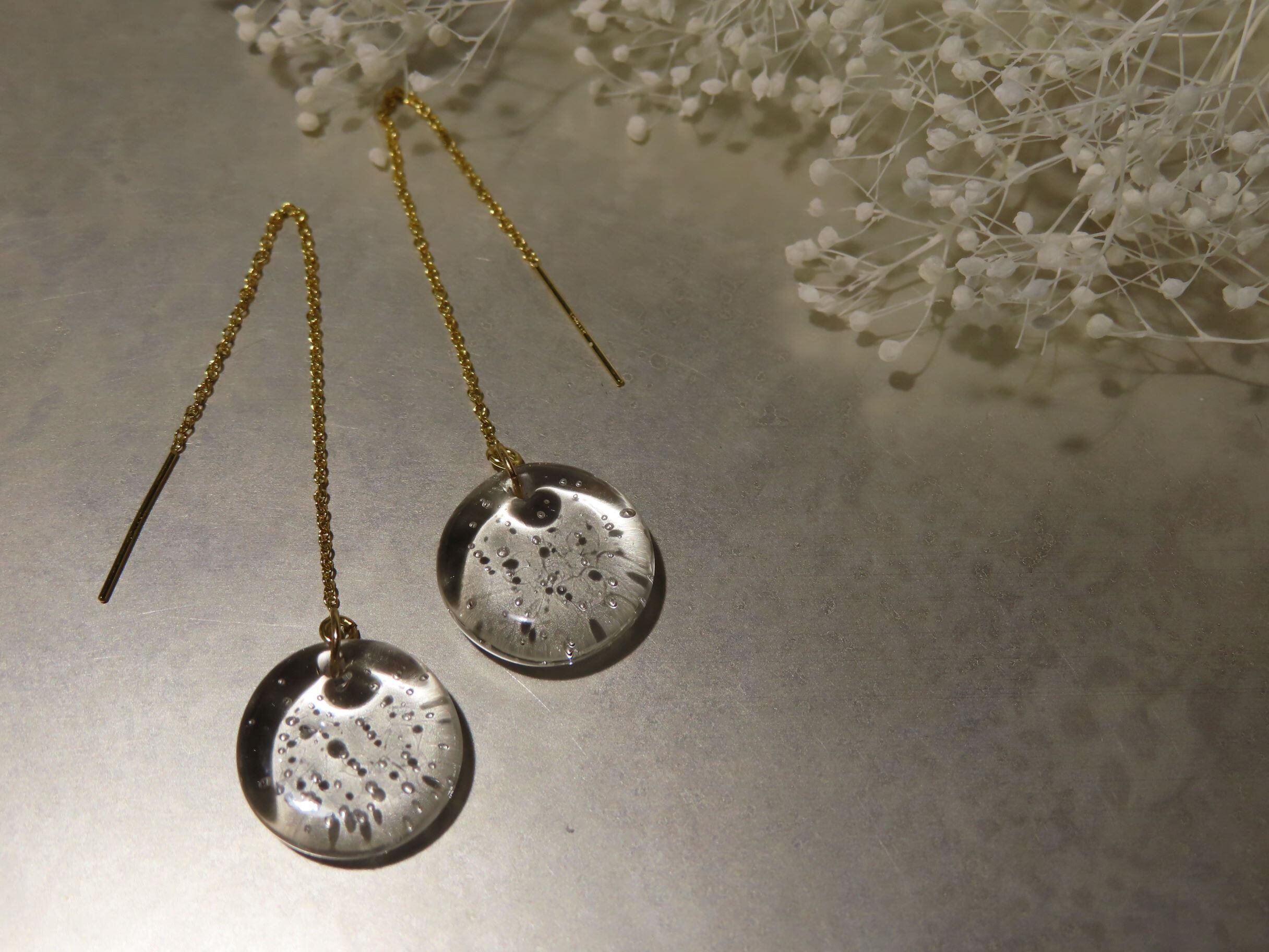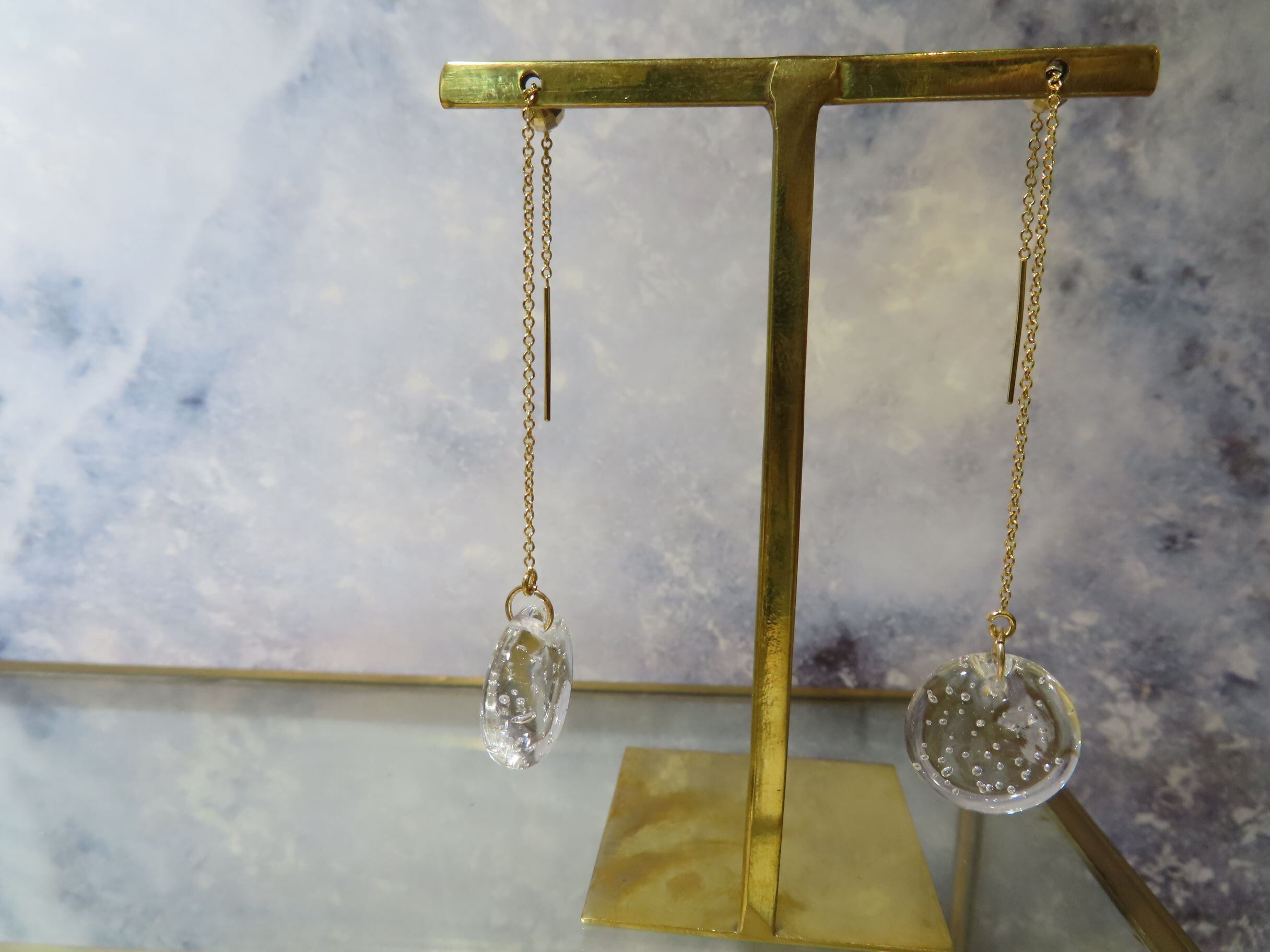 繊細なガラスでできたピアスは、光が透過して輝き、耳元を彩ります